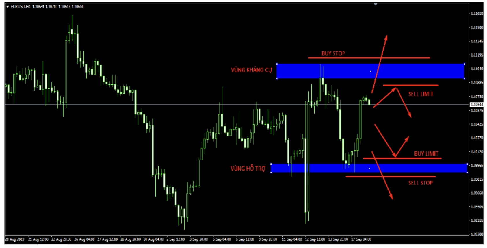 - Buy Stop / Sell Stop: Mua cao / Bán thấp hơn giá hiện tại (Đánh phá vỡ – Breakout).