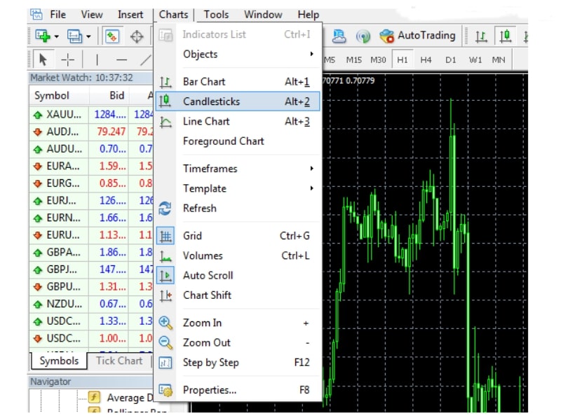 - Candlesticks (Nến Nhật – Alt+2): Đây là “chân ái” của mọi Trader chuyên nghiệp.